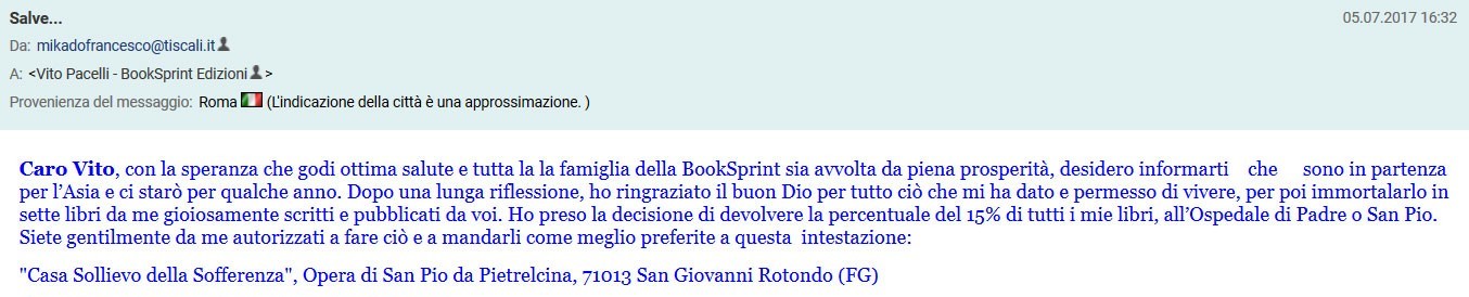 La consapevolezza di Mikado Francescoji di donare la percentuale dei suoi libri al grande miracolo di Padre Pio in arte S. Pio: